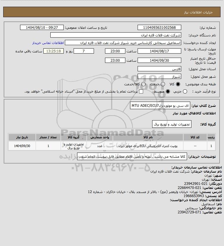 شرح کلی نیاز: ای سی یو موتوردیزلMTU ADEC/ECU7