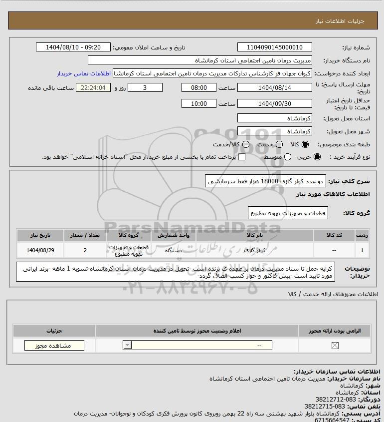 استعلام دو عدد کولر گازی 18000 هزار فقط سرمایشی, استعلام دو عدد کولر گازی 18000 هزار فقط سرمایشی