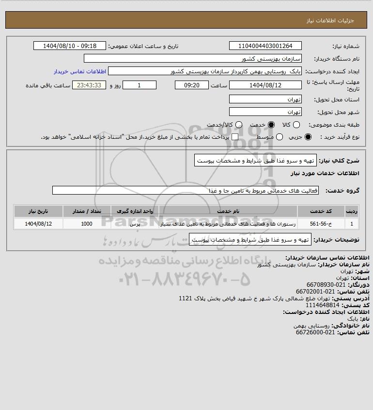 شرح کلی نیاز: تهیه و سرو غذا طبق شرایط و مشخصات پیوست