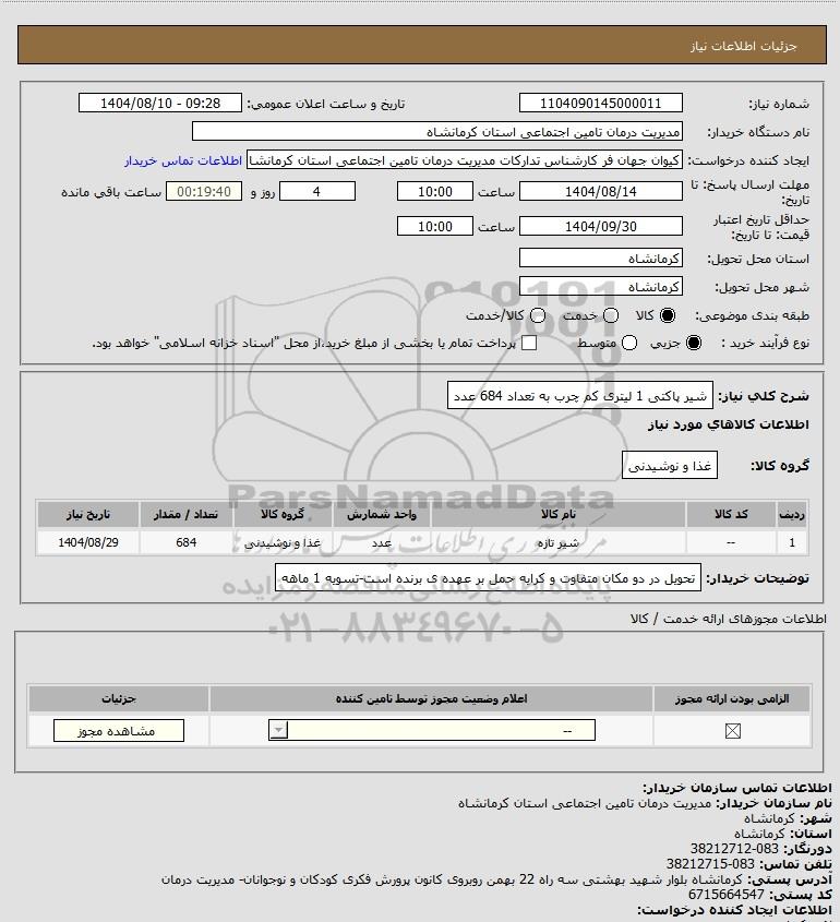 شرح کلی نیاز: شیر پاکتی 1 لیتری کم چرب به تعداد 684 عدد