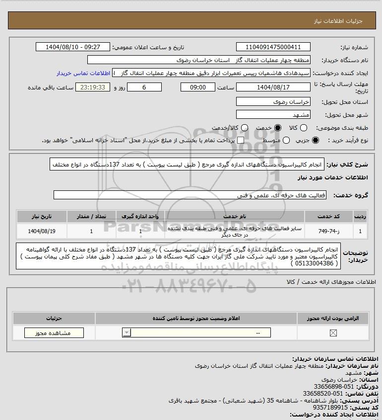 توضیحات خریدار:انجام کالیبراسیون دستگاههای اندازه گیری مرجع ( طبق لیست پیوست ) به تعداد 137دستگاه در انواع مختلف با ارائه گواهینامه کالیبراسیون معتبر و مورد تایید شرکت ملی گاز ایران جهت کلیه دستگاه ها در شهر مشهد ( طبق مفاد شرح کلی پیمان پیوست ) ( 05133004386 )