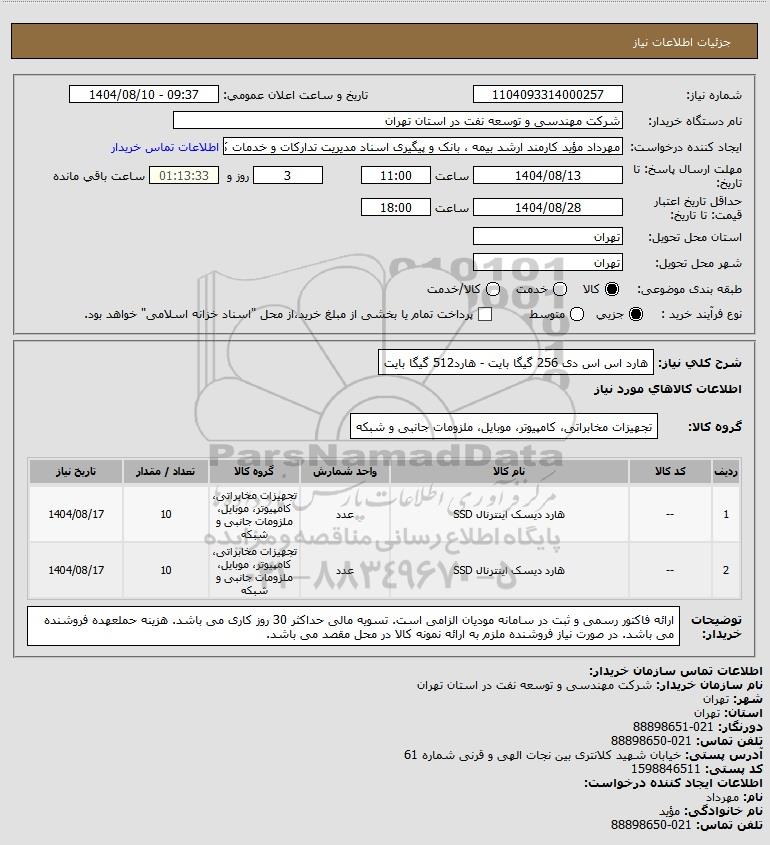 | 2 | -- | هارد دیسک اینترنال SSD | عدد | تجهیزات مخابراتی، کامپیوتر، موبایل، ملزومات جانبی و شبکه | 10 | 1404/08/17 |