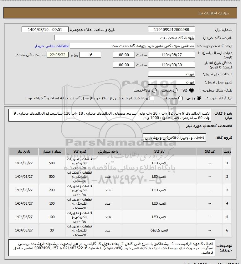 | 2 | -- | لامپ LED | عدد | قطعات و تجهیزات الکتریکی و روشنایی | 500 | 1404/08/27 |