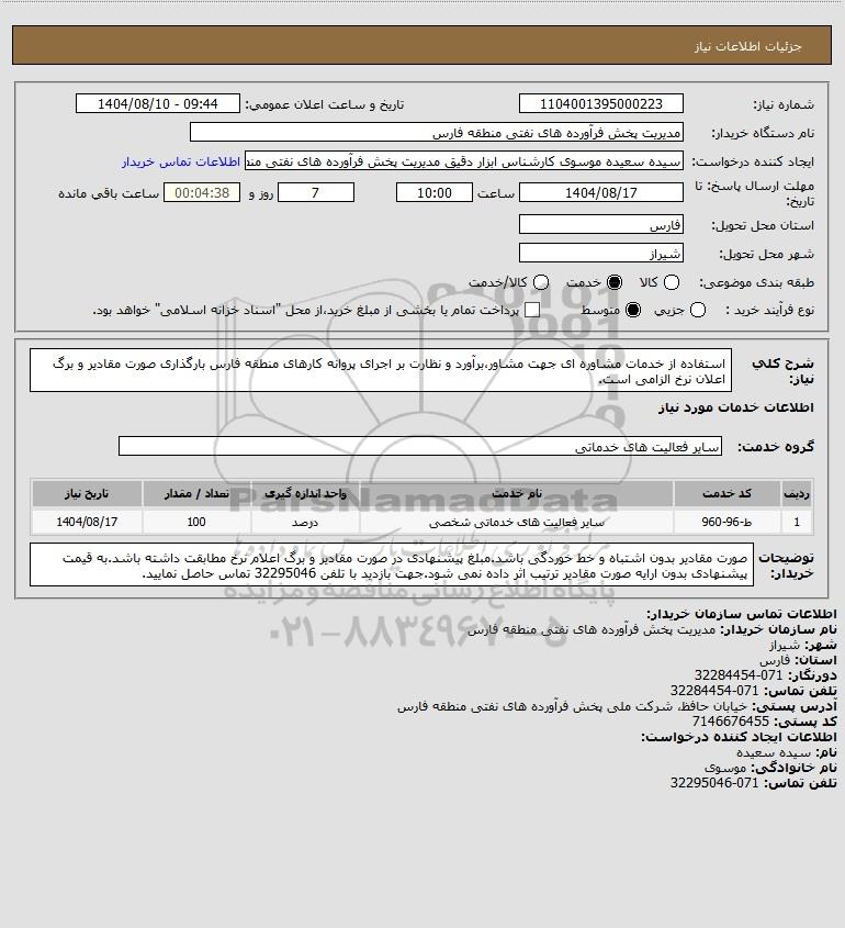 شرح کلی نیاز: استفاده از خدمات مشاوره ای جهت مشاور،برآورد و نظارت بر اجرای پروانه کارهای منطقه فارس بارگذاری صورت مقادیر و برگ اعلان نرخ الزامی است.