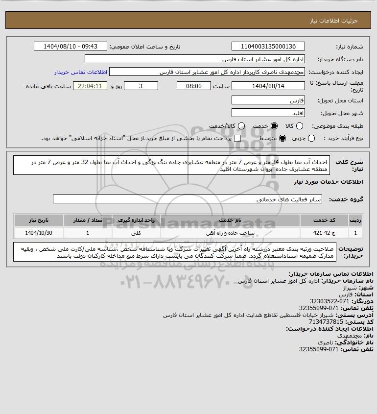شرح کلی نیاز: احداث آب نما بطول 34 متر و عرض 7 متر در منطقه عشایری جاده تنگ وزگی و احداث آب نما بطول 32 متر و عرض 7 متر در منطقه عشایری جاده آبروان شهرستان اقلید