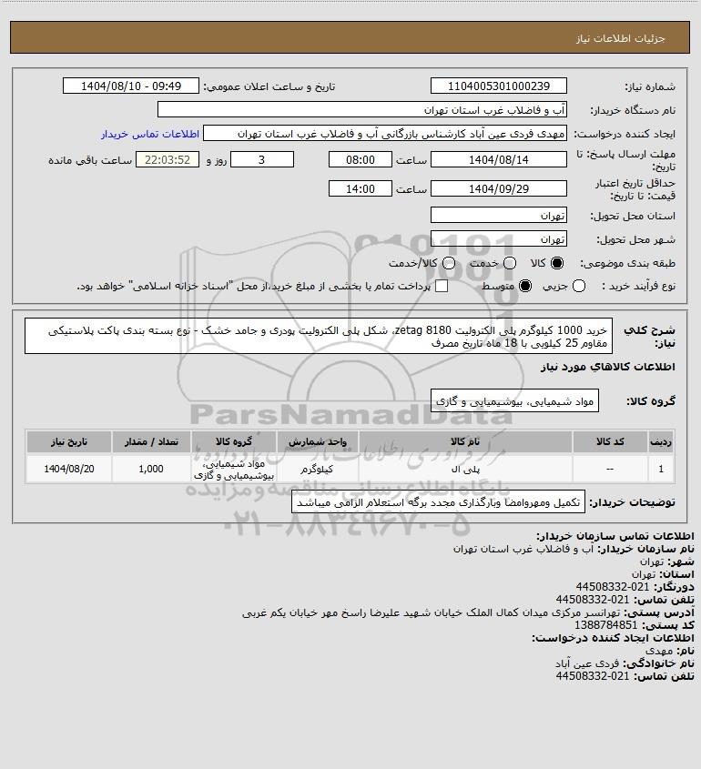 استعلام خرید 1000 کیلوگرم پلی الکترولیت 8180 zetag شکل پلی الکترولیت پودری و جامد خشک - نوع بسته بندی پاکت پلاستیکی مقاوم 25 کیلویی با 18 ماه تاریخ مصرف, استعلام خرید 1000 کیلوگرم پلی الکترولیت 8180 zetag، شکل پلی الکترولیت پودری و جامد خشک - نوع بسته بندی پاکت پلاستیکی مقاوم 25 کیلویی با 18 ماه تاریخ مصرف