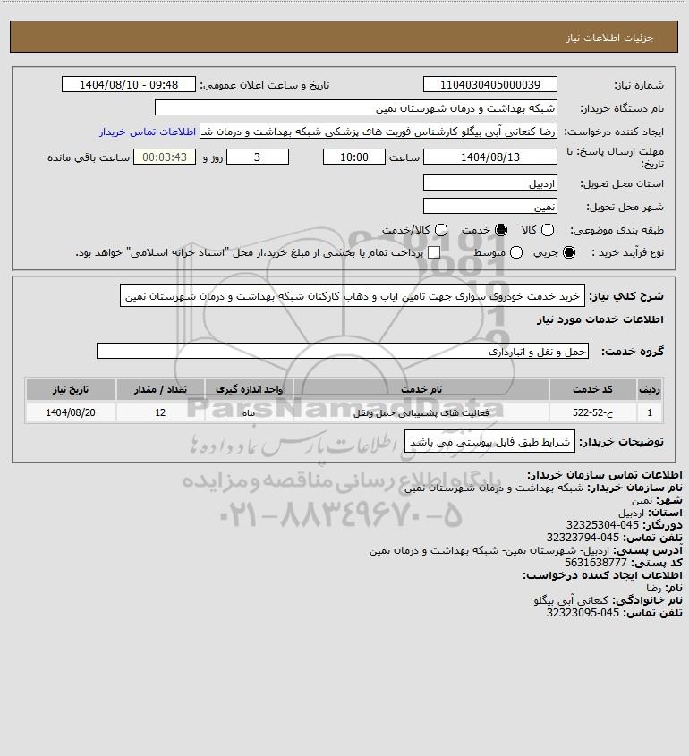 شرح کلی نیاز: خرید خدمت خودروی سواری جهت تامین ایاب و ذهاب کارکنان شبکه بهداشت و درمان شهرستان نمین
