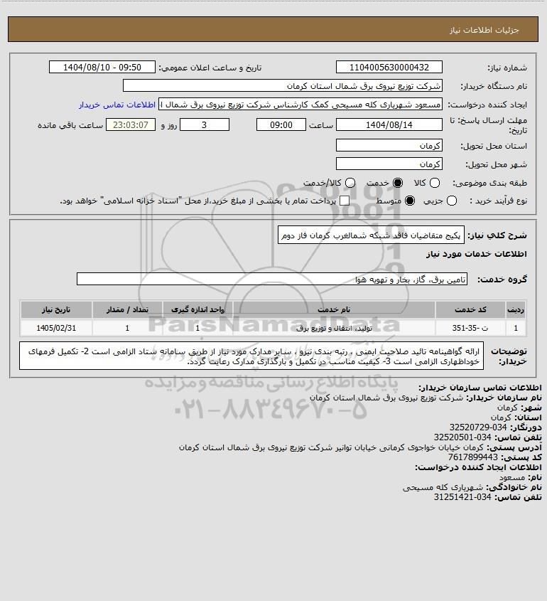 نام دستگاه خریدار:شرکت توزیع نیروی برق شمال استان کرمان