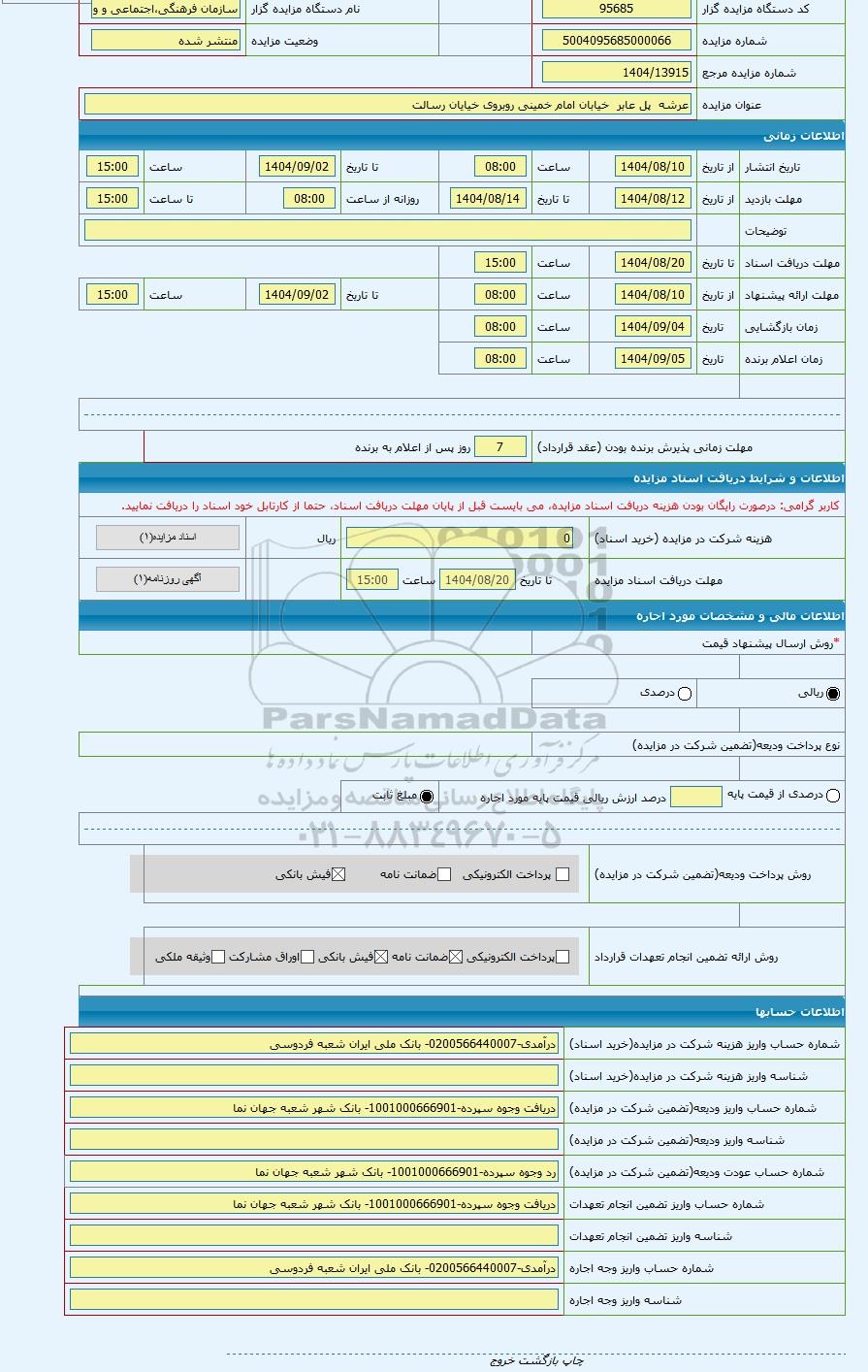 | شماره مورد اجاره | 5104095685000066 | نوع برگزاری مزایده | مزایده عمومی | |