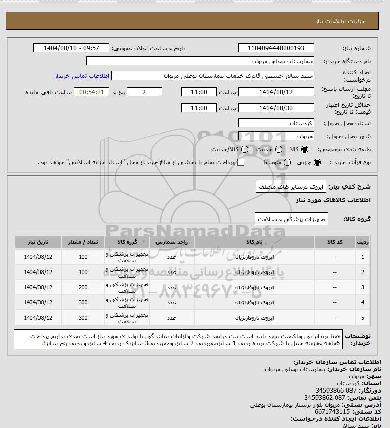 شرح کلی نیاز: ایروی درسایز های مختلف