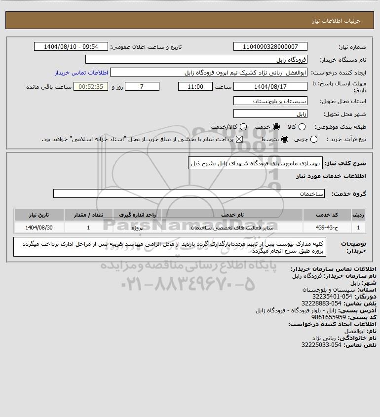 شرح کلی نیاز: بهسازی مامورسرای فرودگاه شهدای زابل بشرح ذیل