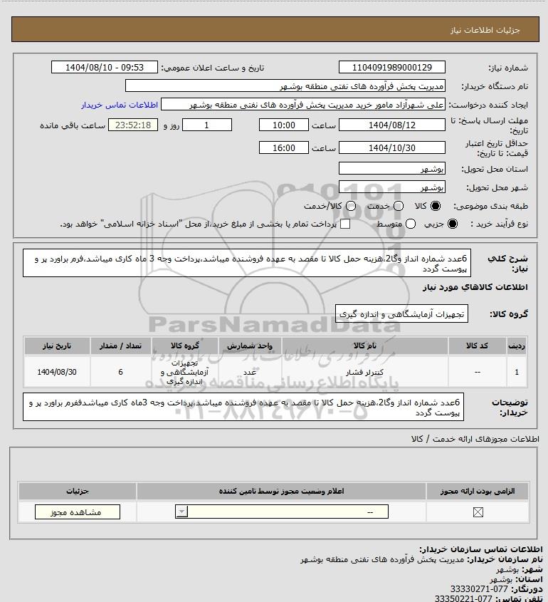 | 1 | -- | کنترلر فشار | عدد | تجهیزات آزمایشگاهی و اندازه گیری | 6 | 1404/08/30 |