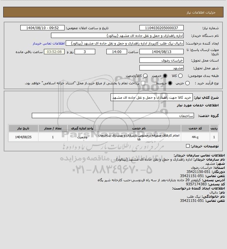 شرح کلی نیاز: خرید کالا جهت راهداری و حمل و نقل جاده ای مشهد