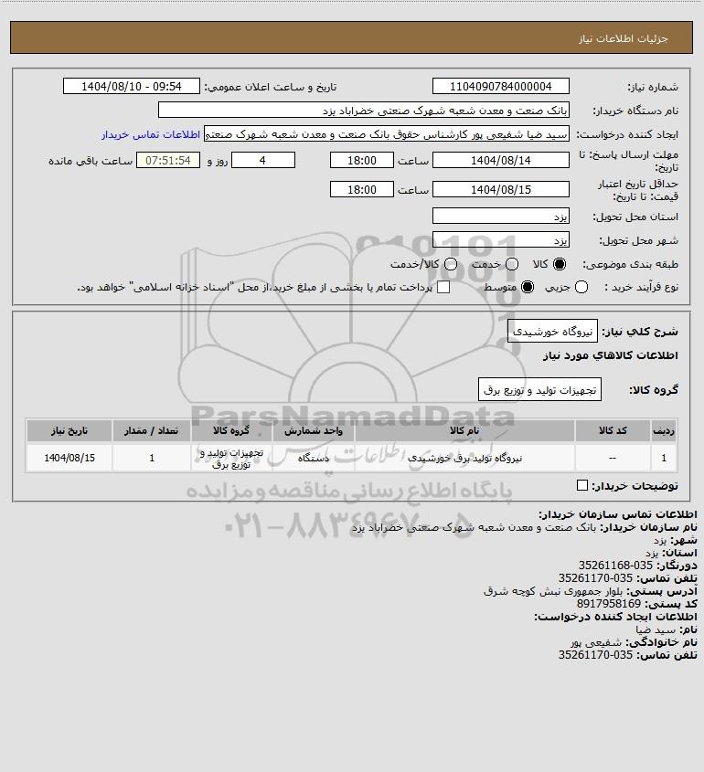 | 1 | -- | نیروگاه تولید برق خورشیدی | دستگاه | تجهیزات تولید و توزیع برق | 1 | 1404/08/15 |