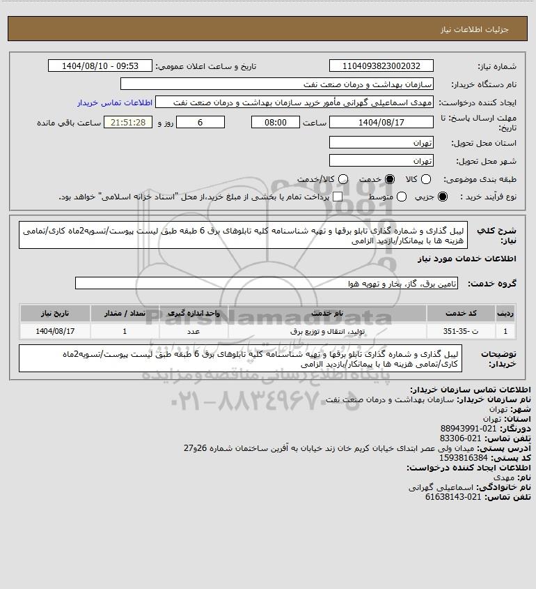 شرح کلی نیاز: لیبل گذاری و شماره گذاری تابلو برقها و تهیه شناسنامه کلیه تابلوهای برق 6 طبقه
