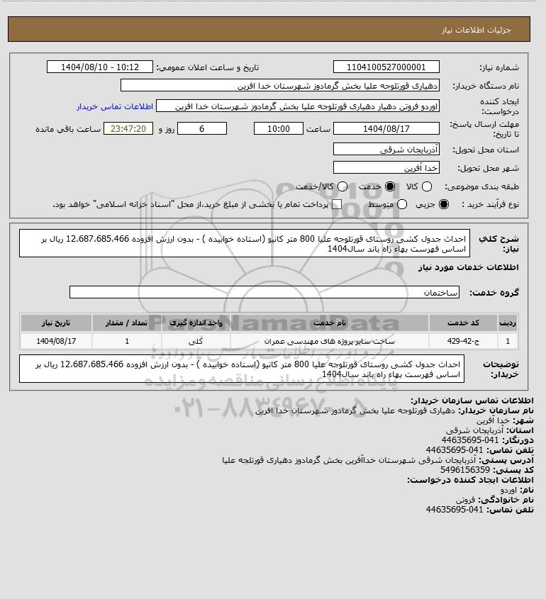 شرح کلی نیاز: احداث جدول کشی روستای قورتلوجه علیا 800 متر کانیو (استاده خوابیده ) - بدون ارزش افزوده 12،687،685،466 ریال بر اساس فهرست بهاء راه باند سال1404