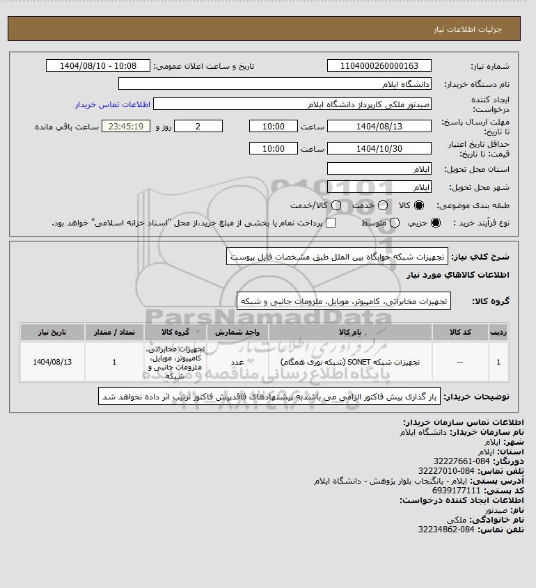 | 1 | -- | تجهیزات شبکه SONET (شبکه نوری همگام) | عدد | تجهیزات مخابراتی، کامپیوتر، موبایل، ملزومات جانبی و شبکه | 1 | 1404/08/13 |