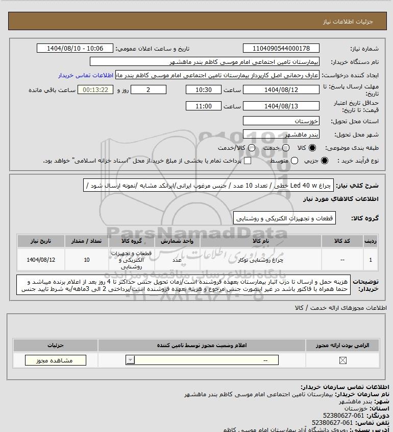 شرح کلی نیاز: چراغ Led 40 w خطی / تعداد 10 عدد / جنس مرغوب ایرانی/ایرانکد مشابه /نمونه ارسال شود /