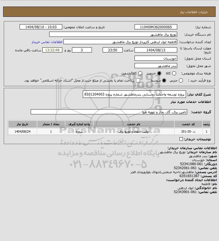 شرح کلی نیاز: پروژه توسعه واحداث روستایی بندرماهشهر شماره پروژه 8101204003