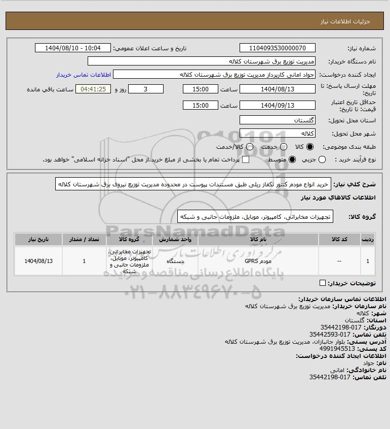 شرح کلی نیاز: خرید انواع مودم کنتور تکفاز ریلی طبق مستندات پیوست در محدوده مدیریت توزیع نیروی برق شهرستان کلاله