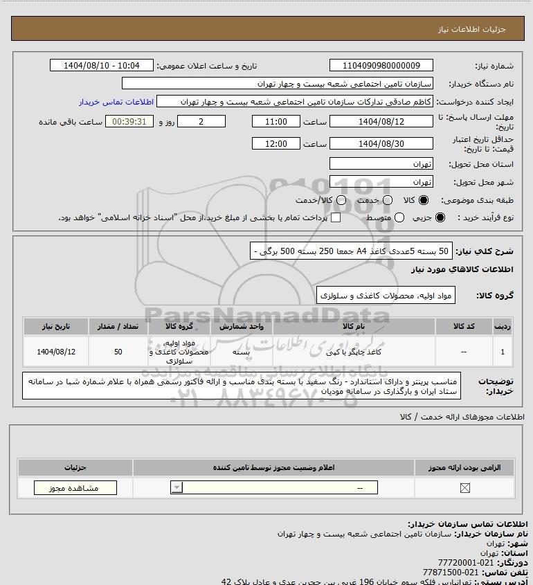 | 1 | -- | کاغذ چاپگر یا کپی | بسته | مواد اولیه، محصولات کاغذی و سلولزی | 50 | 1404/08/12 |