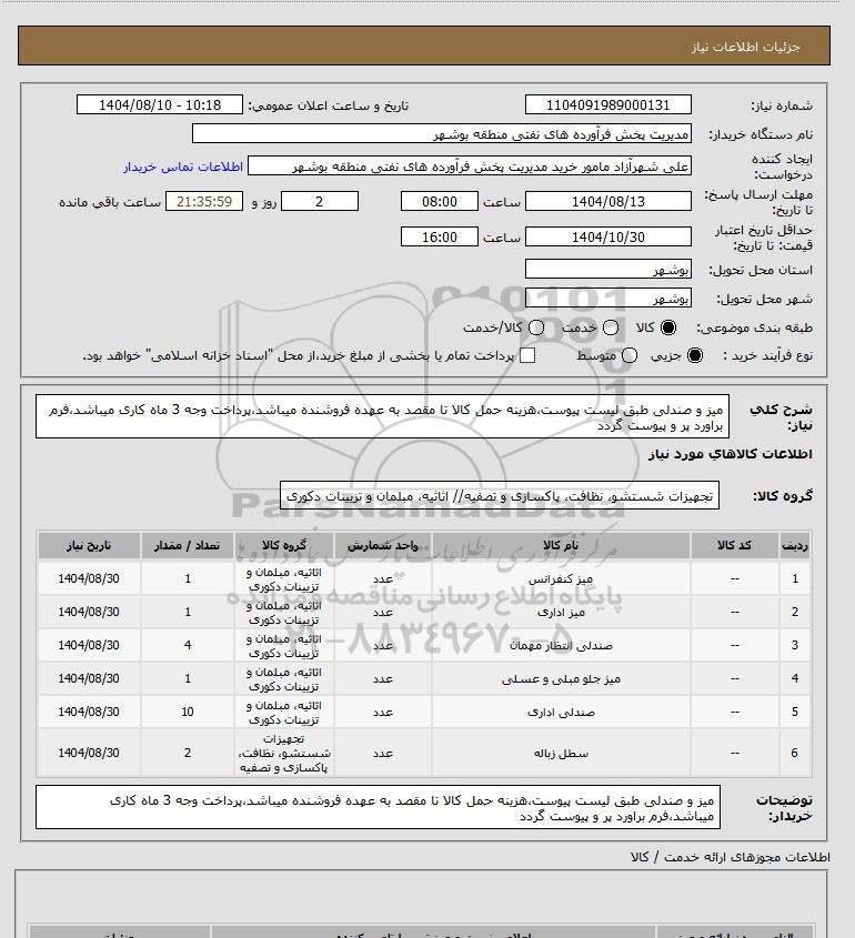 شرح کلی نیاز: میز و صندلی طبق لیست پیوست،هزینه حمل کالا تا مقصد به عهده فروشنده میباشد،پرداخت وجه 3 ماه کاری میباشد،فرم براورد پر و پیوست گردد