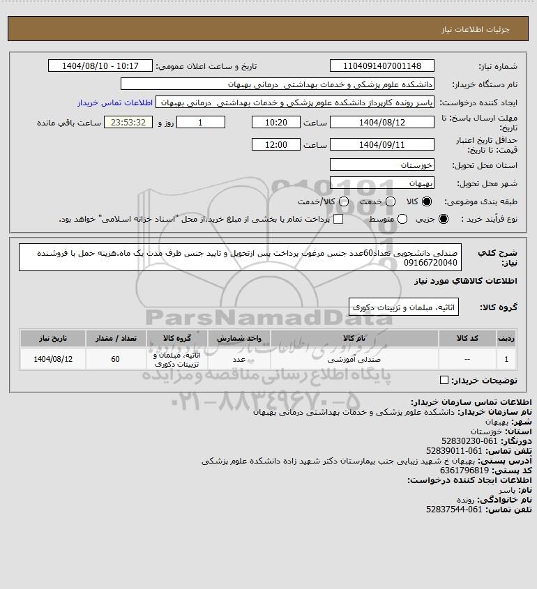 | 1 | -- | صندلی آموزشی | عدد | اثاثیه، مبلمان و تزیینات دکوری | 60 | 1404/08/12 |