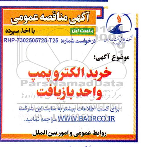 موضوع آگهی: خرید الکتروپمپ واحد بازیافت