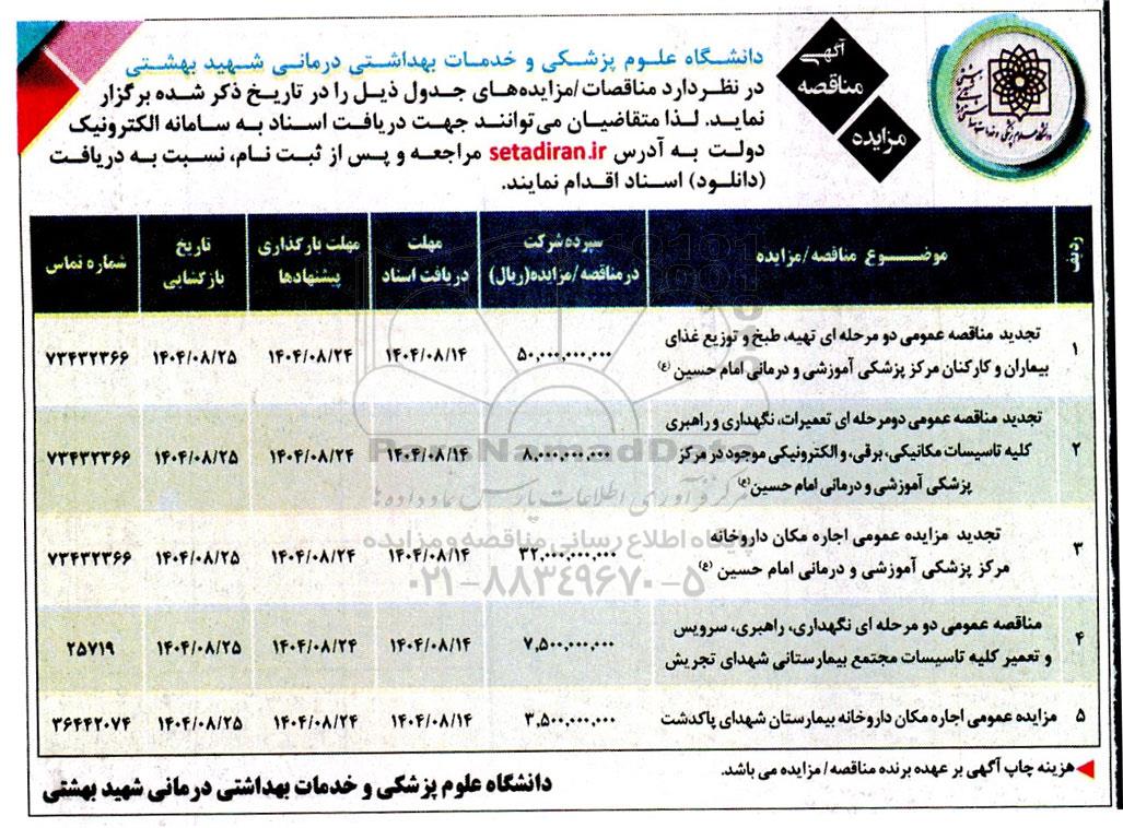 2 تجدید مناقصه عمومی دو مرحله ای تعمیرات نگهداری و راهبری کلیه تاسیسات مکانیکی برقی و الکترونیکی موجود در مرکز پزشکی آموزشی و درمانی امام حسین (ع) 8.000.000.000  1404.8.14 1404.8.24  1404.8.25  73432366