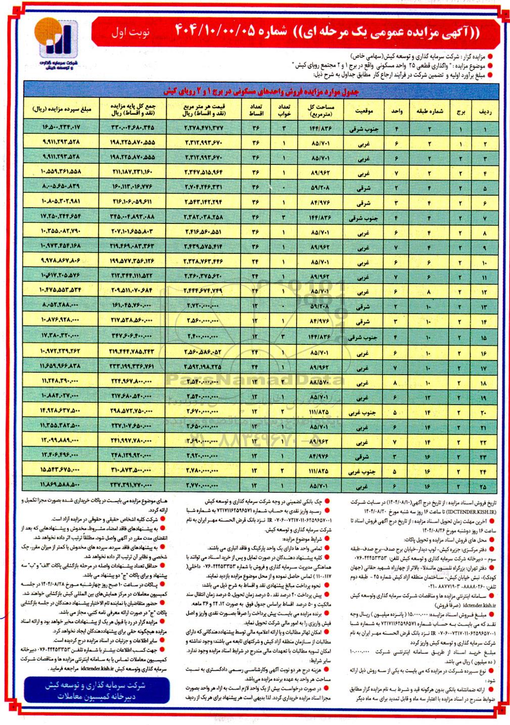 جدول موارد مزایده فروش واحدهای مسکونی در برج 1 و 2 رویای کیش