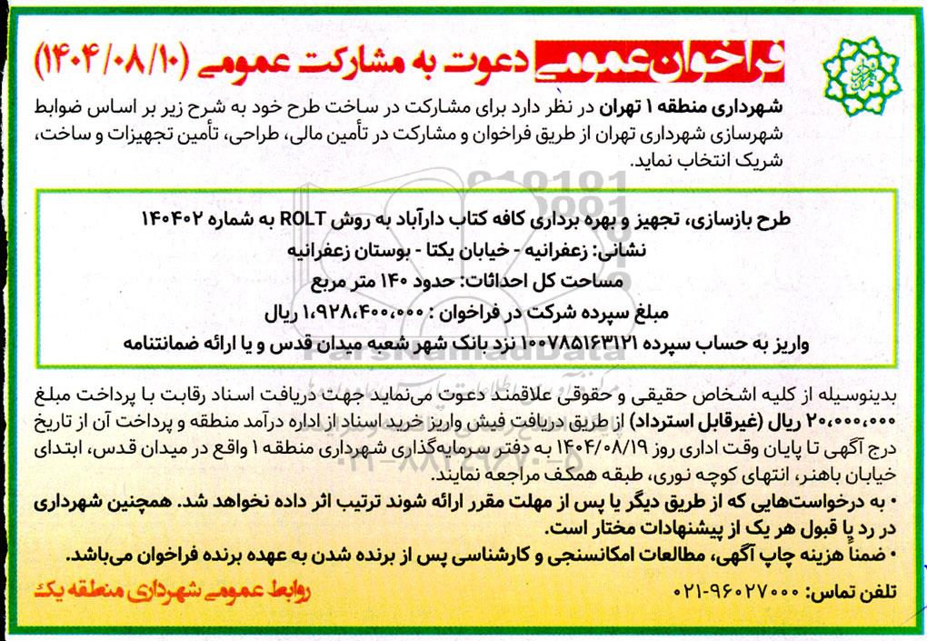طرح بازسازی، تجهیز و بهره برداری کافه کتاب دارآباد به روش ROLT به شماره 140402