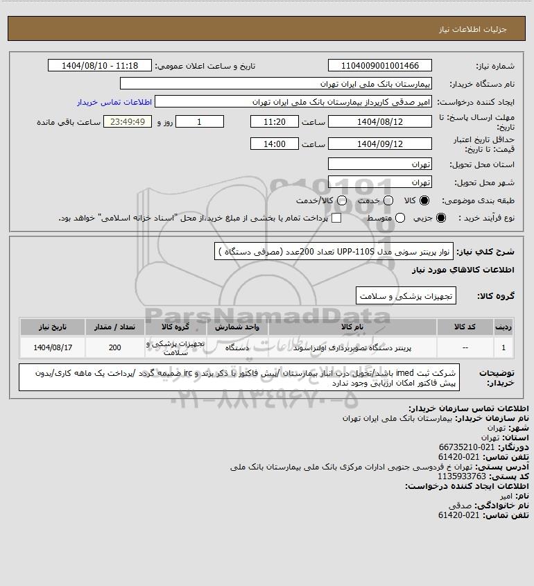 نام سازمان خریدار: بیمارستان بانک ملی ایران تهران
