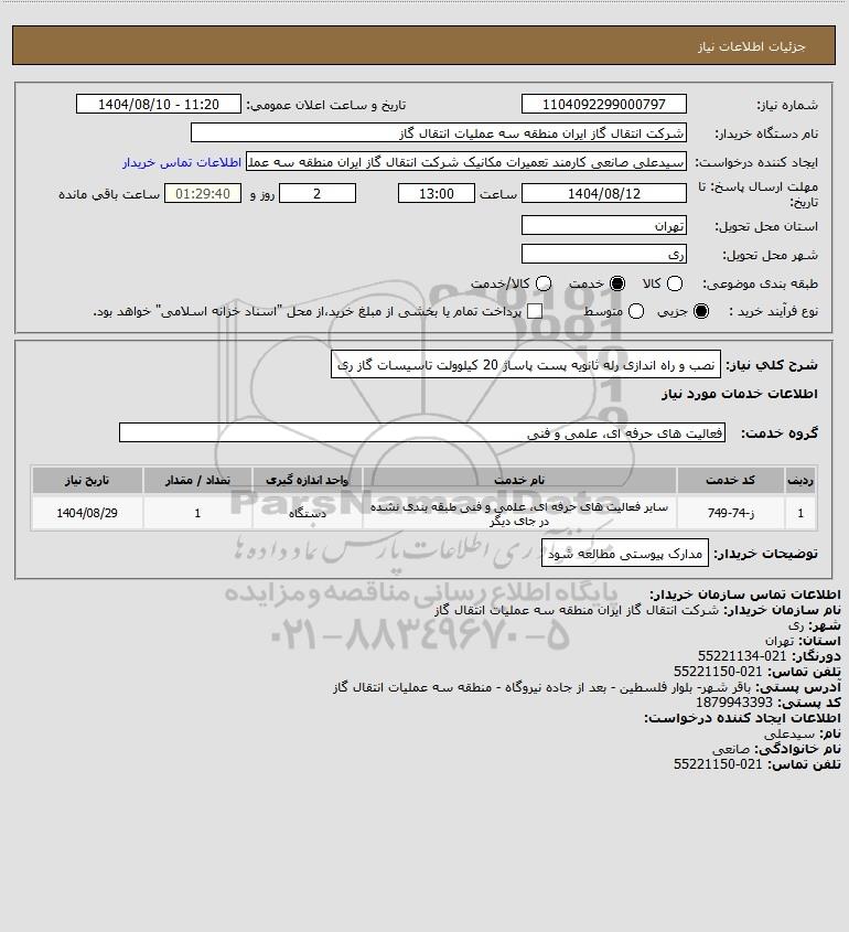 شرح کلی نیاز: نصب و راه اندازی رله ثانویه پست پاساژ 20 کیلوولت تاسیسات گاز ری