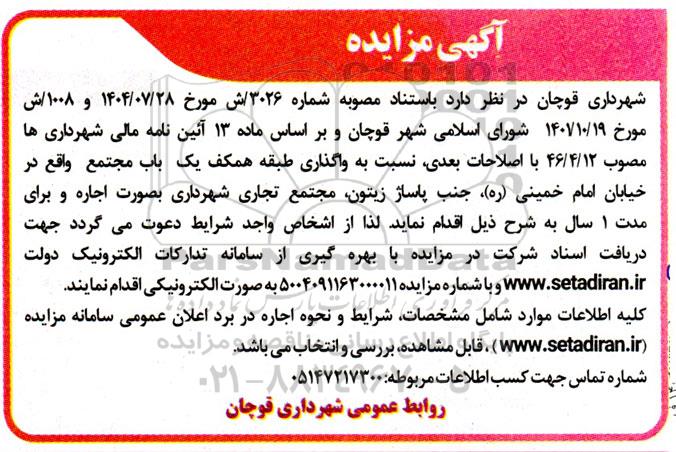 شهرداری قوچان در نظر دارد باستناد مصوبه شماره 3026ش مورخ 1404.07.28 و 1008 .ش مورخ 140710.19 شورای اسلامی شهر قوچان و بر اساس ماده 13 آئین نامه مالی شهرداری ها مصوب 46.4.12 با اصلاحات بعدی نسبت به واگذاری طبقه همکف یک باب مجتمع واقع در خیابان امام خمینی (ره) جنب پاساژ زیتون، مجتمع تجاری شهرداری بصورت اجاره و برای مدت 1 سال به شرح ذیل اقدام نماید لذا از اشخاص واجد شرایط دعوت می گردد جهت دریافت اسناد شرکت در مزایده با بهره گیری از سامانه تدارکات الکترونیک دولت ستاد ایران و با شماره مزایده 5004091163000011 به صورت الکترونیکی اقدام نمایند.