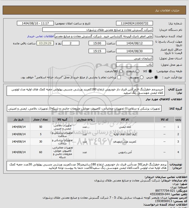 شرح کلی نیاز: خریدپرچم خطر(رنگ قرمز)آنتن فنری دار خودرویی ارتفاع 180کمربند ورزشی چسبی پهلوانی جعبه کمک های اولیه مدل لوتوس کلاه ایمنی مهندسی رنگ سفید