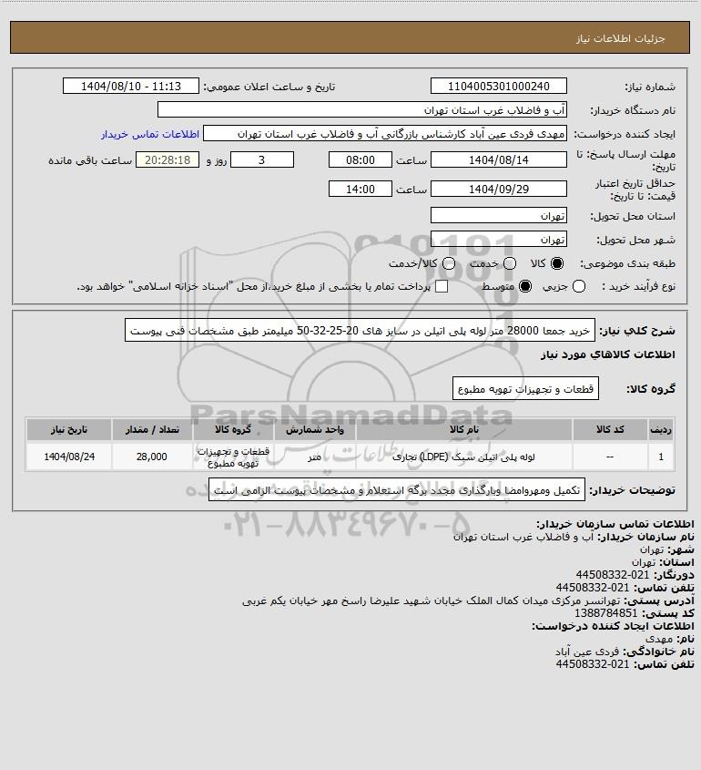 شرح کلی نیاز: خرید جمعا 28000 متر لوله پلی اتیلن در سایز های 20-25-32-50 میلیمتر طبق مشخصات فنی پیوست