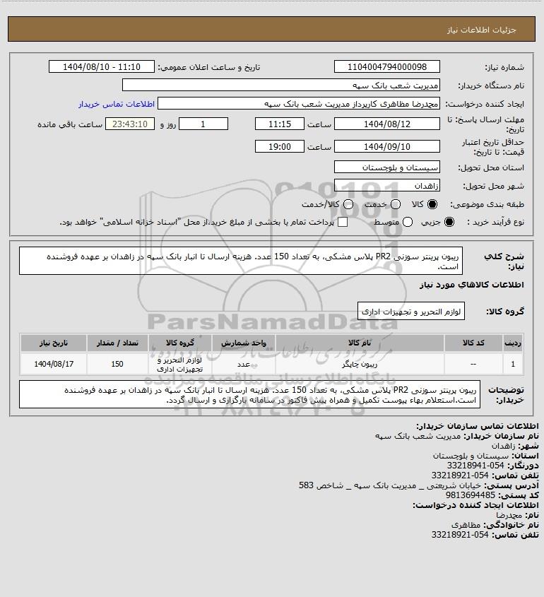 شرح کلی نیاز: ریبون پرینتر سوزنی PR2 پلاس مشکی، به تعداد 150 عدد. هزینه ارسال تا انبار بانک سپه در زاهدان بر عهده فروشنده است.