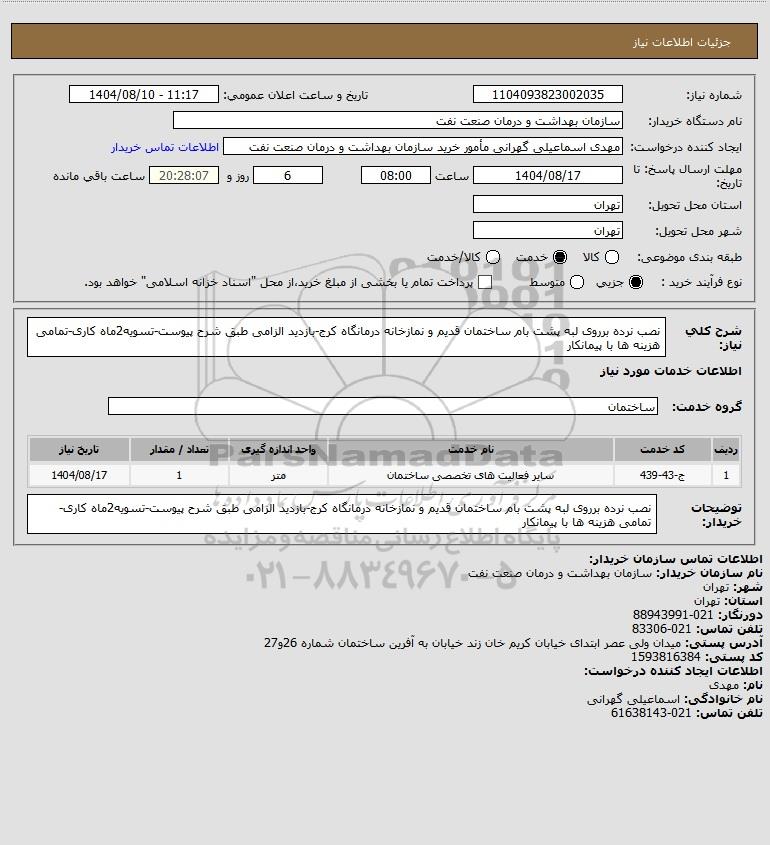 استعلام بها و موضوع استعلام استعلام نصب نرده برروی لبه پشت بام ساختمان قدیم و نمازخانه درمانگاه کرج-بازدید الزامی طبق شرح پیوست-تسویه2ماه کاری-تمامی هزینه ها با پیمانکار به اطلاع کلیه شرکتها و افراد متخصص واجد شرایط میرساند، آگهی گذار در نظر دارد از طریق استعلام بها، نسبت به انتخاب و دریافت پیشنهادات اقدام نماید. این استعلام با کد آگهی ثبت شده در سامانه خبرگزاری پارس نماد : 9780045 منتشر شده است. مشخصات استعلام : تاریخ شروع استعلام: 1404/08/10 آخرین مهلت ارسال پیشنهاد قیمت : 1404/08/17 و محل اجرای پروژه : استان تهران میباشد. استعلام قیمت مورد درخواست : استعلام نصب نرده برروی لبه پشت بام ساختمان قدیم و نمازخانه درمانگاه کرج-بازدید الزامی طبق شرح پیوست-تسویه2ماه کاری-تمامی هزینه ها با پیمانکار با دستهبندیهای تخصصی و گروه های مرتبط : سازه های فلزی و فضایی, ساختمان, استعلام اطلاع رسانی میگردد.