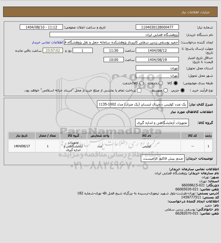 | 1 | -- | کولیس | عدد | تجهیزات آزمایشگاهی و اندازه گیری | 1 | 1404/08/17 |