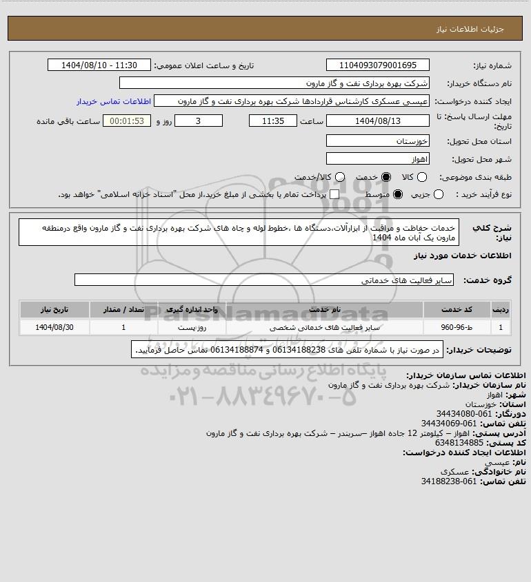 شرح کلی نیاز: خدمات حفاظت و مراقبت از ابزارآلات،دستگاه ها ،خطوط لوله و چاه های شرکت بهره برداری نفت و گاز مارون واقع درمنطقه مارون یک آبان ماه 1404