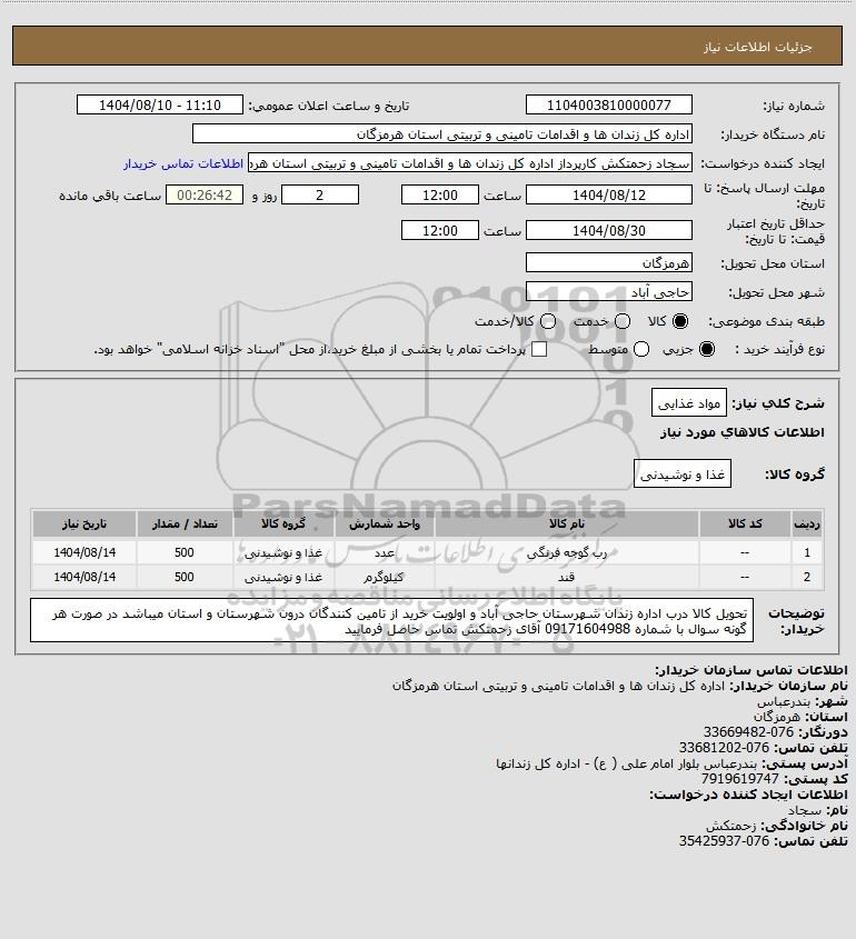 توضیحات خریدار:تحویل کالا درب اداره زندان شهرستان حاجی آباد و اولویت خرید از تامین کنندگان درون شهرستان و استان میباشد در صورت هر گونه سوال با شماره 09171604988 آقای زحمتکش تماس حاصل فرمایید