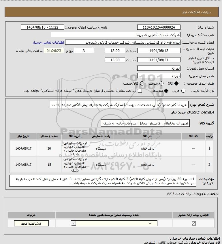 | 2 | -- | بارکد خوان | دستگاه | تجهیزات مخابراتی، کامپیوتر، موبایل، ملزومات جانبی و شبکه | 15 | 1404/08/17 |
