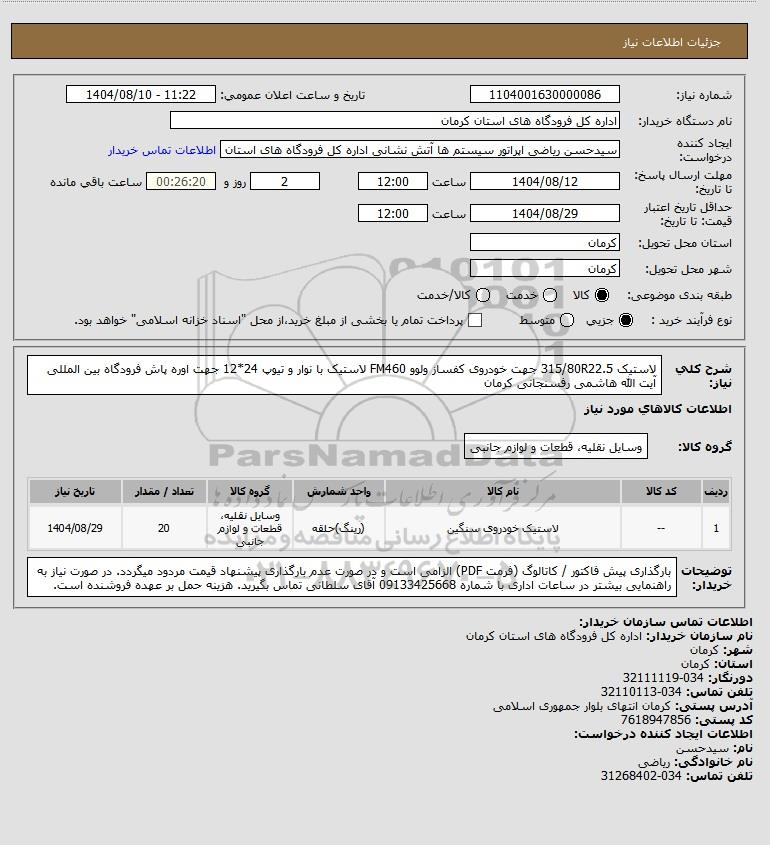 | 1 | -- | لاستیک خودروی سنگین | (رینگ)حلقه | وسایل نقلیه، قطعات و لوازم جانبی | 20 | 1404/08/29 |