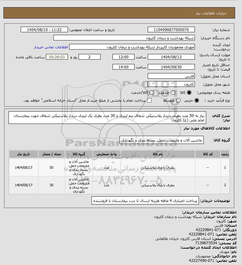 شرح کلی نیاز: نیاز به 50 عدد بطری دربدار پلاستیکی شفاف نیم لیتری و 30 عدد بطری یک لیتری دربدار پلاستیکی شفاف جهت بیمارستان امام علی (ع) کازرون