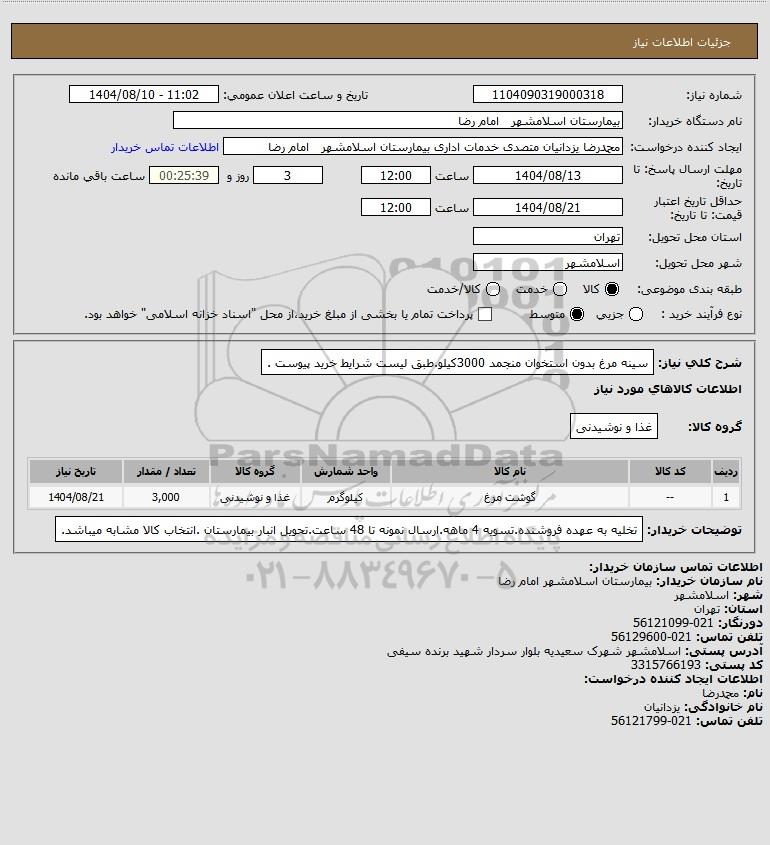 شرح کلی نیاز: سینه مرغ بدون استخوان منجمد 3000کیلو.طبق لیست شرایط خرید پیوست .