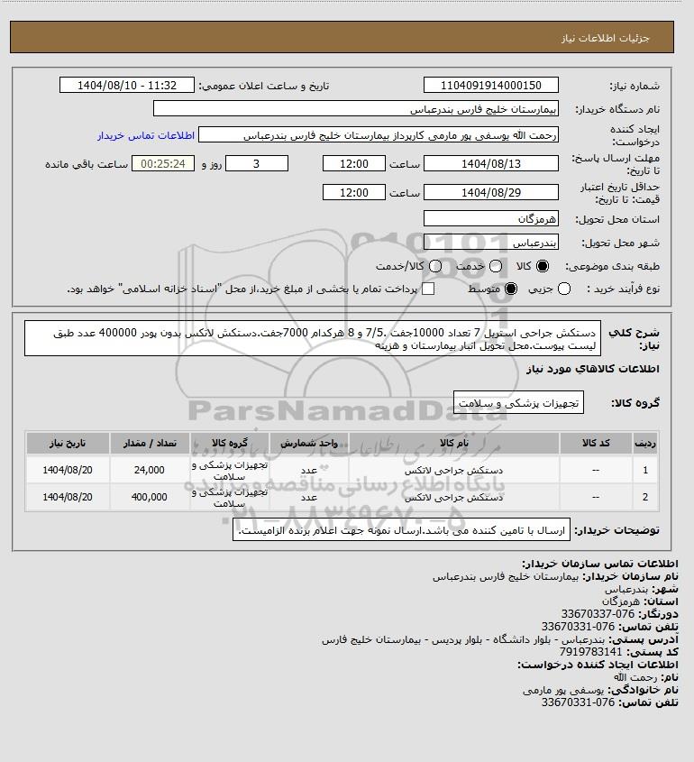 | 1 | -- | دستکش جراحی لاتکس | عدد | تجهیزات پزشکی و سلامت | 24,000 | 1404/08/20 |