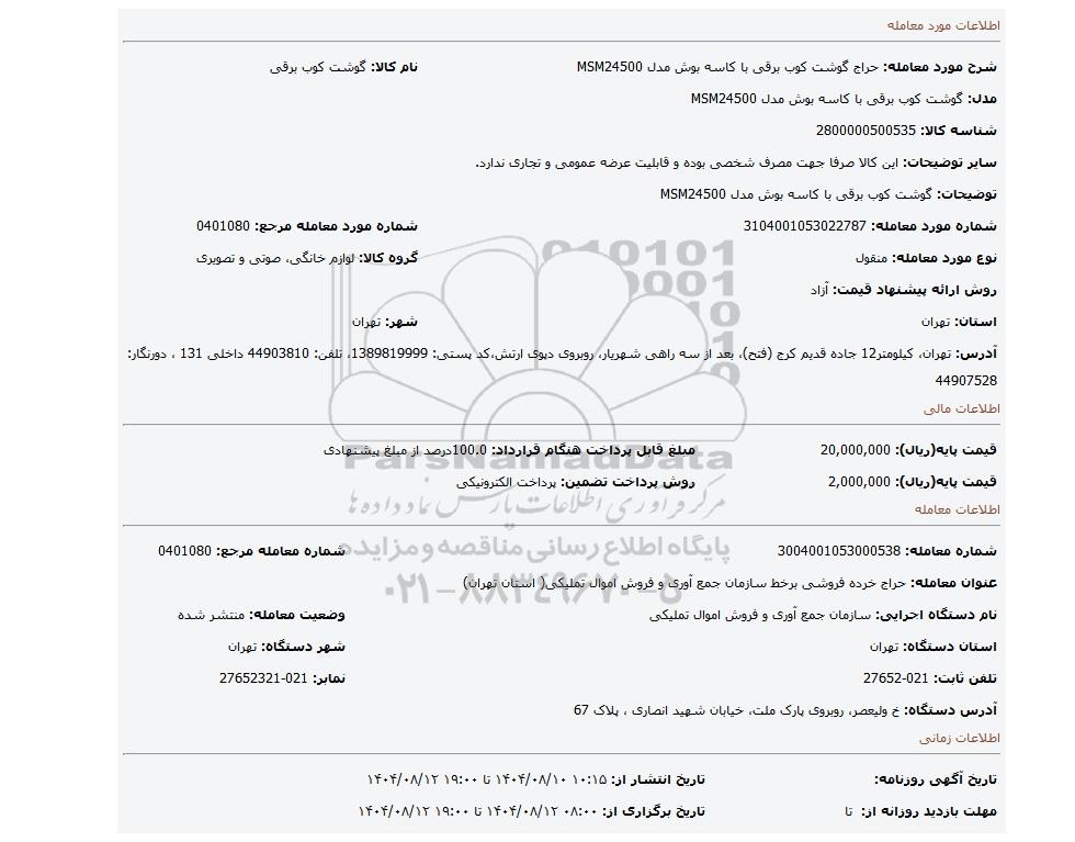 عنوان معامله: حراج خرده فروشی برخط سازمان جمع آوری و فروش اموال تملیکی( استان تهران)