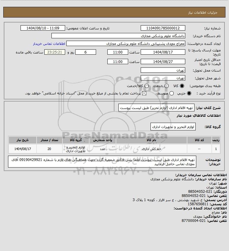 شرح کلی نیاز: تهیه اقلام اداری (لوازم تحریر) طبق لیست پیوست