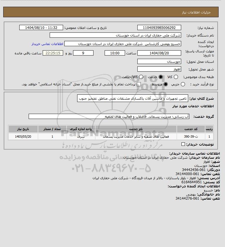 شرح کلی نیاز: تامین تجهیزات و ماشین آلات پاکسازی مشتقات نفتی مناطق نفتخیز جنوب