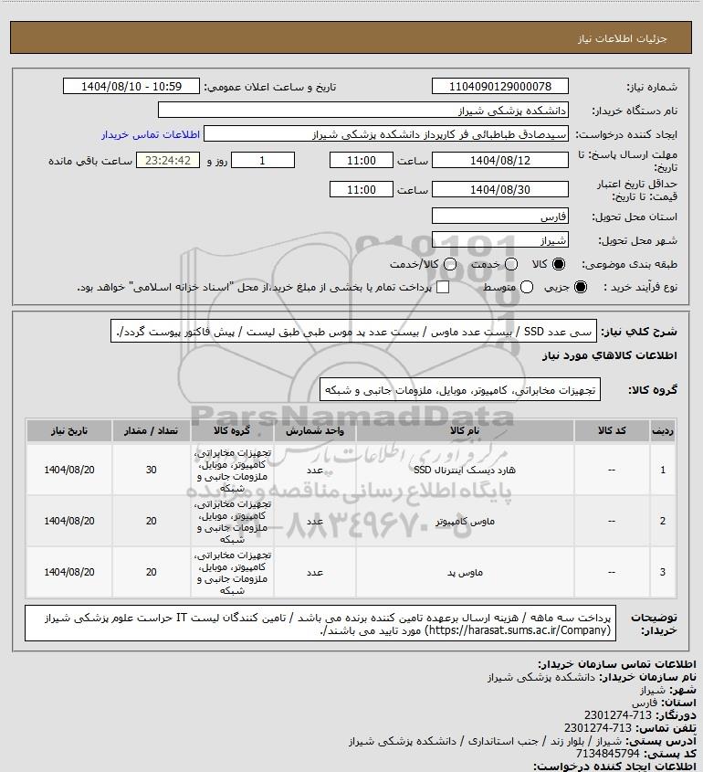 شرح کلی نیاز: سی عدد SSD / بیست عدد ماوس / بیست عدد پد موس طبی طبق لیست / پیش فاکتور پیوست گردد/.